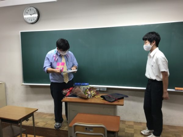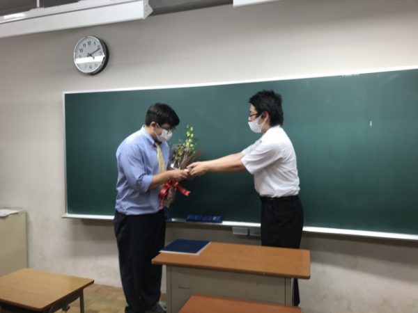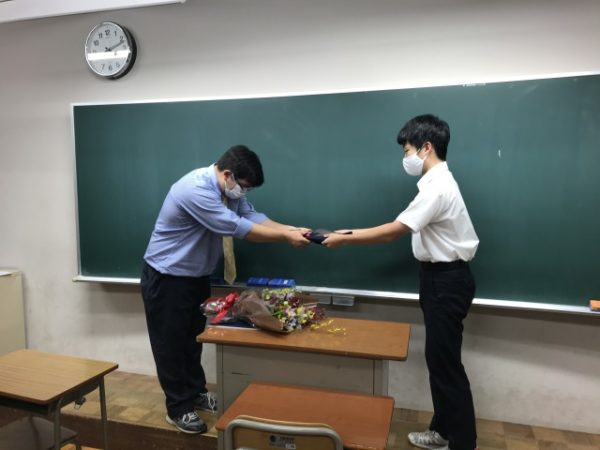 カミーロ先生からお別れの挨拶をしていただき、ヘジュダス先生のお言葉の後、生徒から花束と記念品をカミーロ先生に贈呈しました。記念品は、みんなで英語で書いた色紙、部員1人1人がカミーロ先生へのメッセージを録画編集したビデオ、そして生徒が家族と作ってくれたびっくり箱でした。
