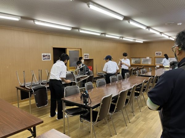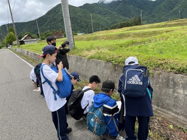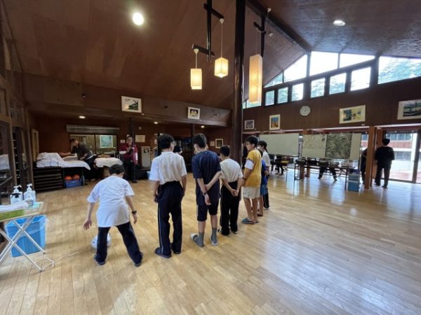 木崎湖ハイキングの予定でしたが、雨が予想されたため、休憩地点まで皆で行って折り返し、班ごとに時間差をつけて山荘に帰るオリエンテーリングを行いました。いきなり逆方向に行ってしまった班もありましたが、最終的には全班無事に帰ってこられました。