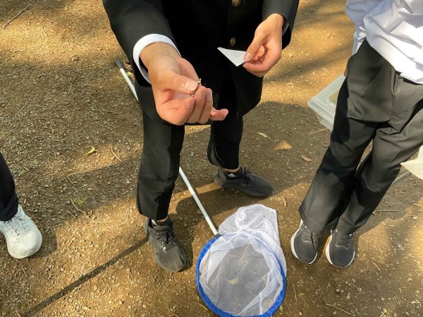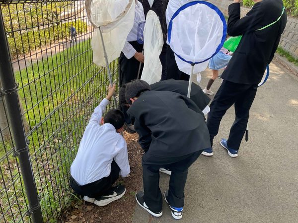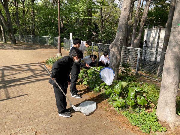 生物部では、土曜日で天気がよいときに、学校に隣接する都立城北中央公園に生物観察・採集に行きます。 今回は4月ということもあり、中学1年生の仮入部に来た生徒も一緒に、部の所有の捕虫網を持って公園に行きました。 この日は最高気温27℃で暖かく、ソメイヨシノは散っていましたが、ツツジが咲き始めており、多くの草花やモンシロチョウなどの昆虫が見られました。 また、池ではオタマジャクシが多数見られました。 仮入部期間中にも、また城北中央公園へ観察・採集に行く予定です。