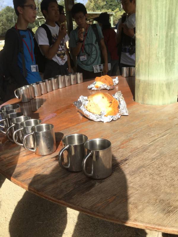 実演の後、ビリー茶とダッチオーブンで焼いた素朴なダンパーと呼ばれるパンを試食しました。