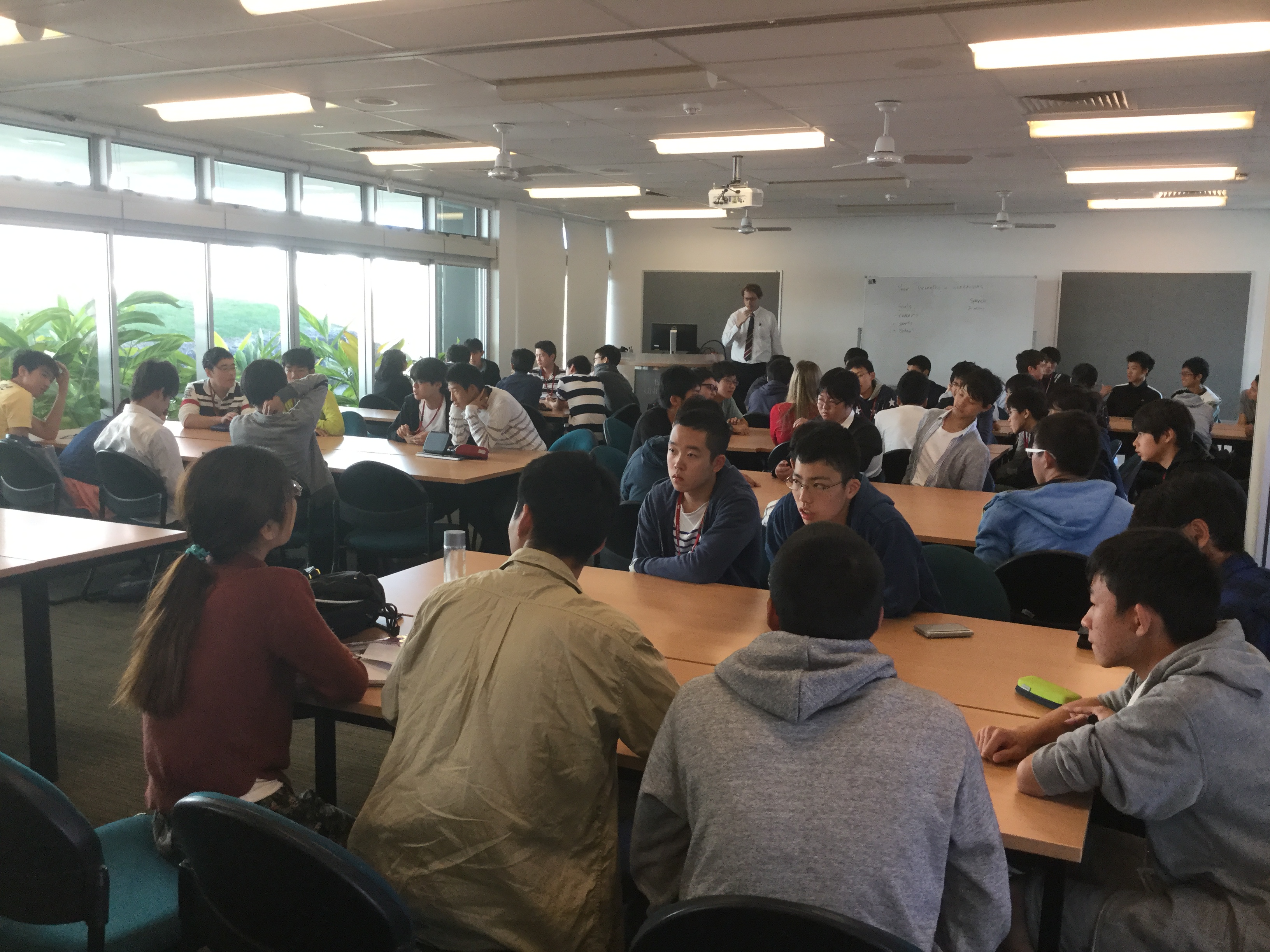 本日高校1年生は、1時間目に英語で授業を受けて、2時間目にボンド大学の学生たち6人とのセッションに参加しました。