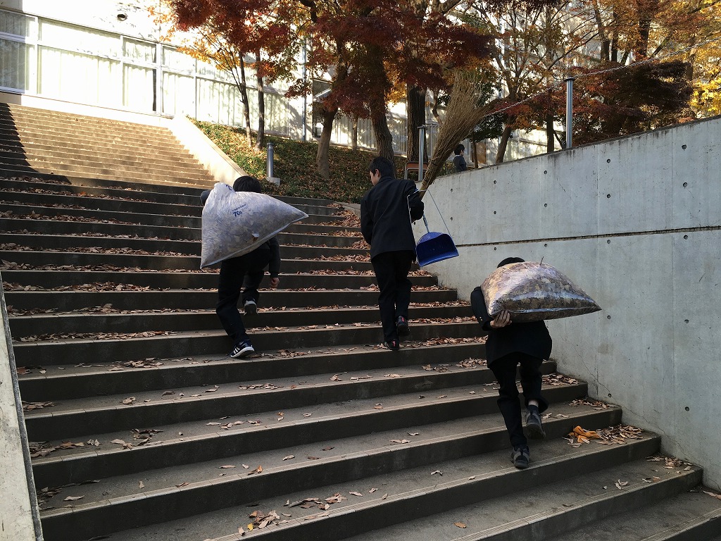 ほうきで落ち葉を集める係と、落ち葉をちりとりに収める係、ビニール袋に詰める係というように、役割を分担してがんばっています。