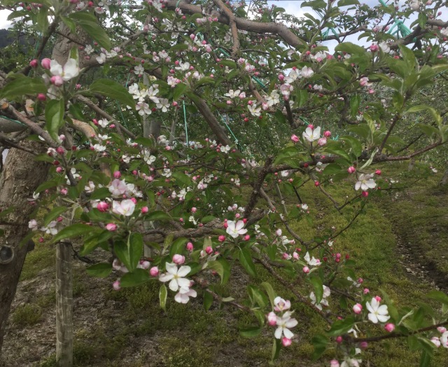 体育館・木崎湖と山荘の途中にはリンゴ畑があり、リンゴの花が咲いていました。